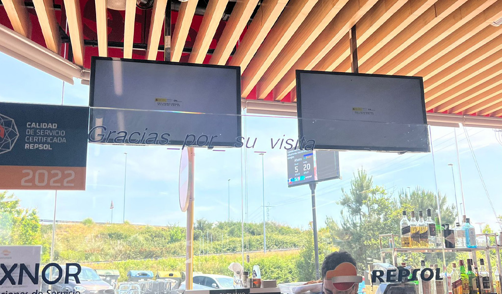 Diferentes tipos de soportes digitales situados en el exterior, en surtidores, en zonas de caja, tienda y restaurante.